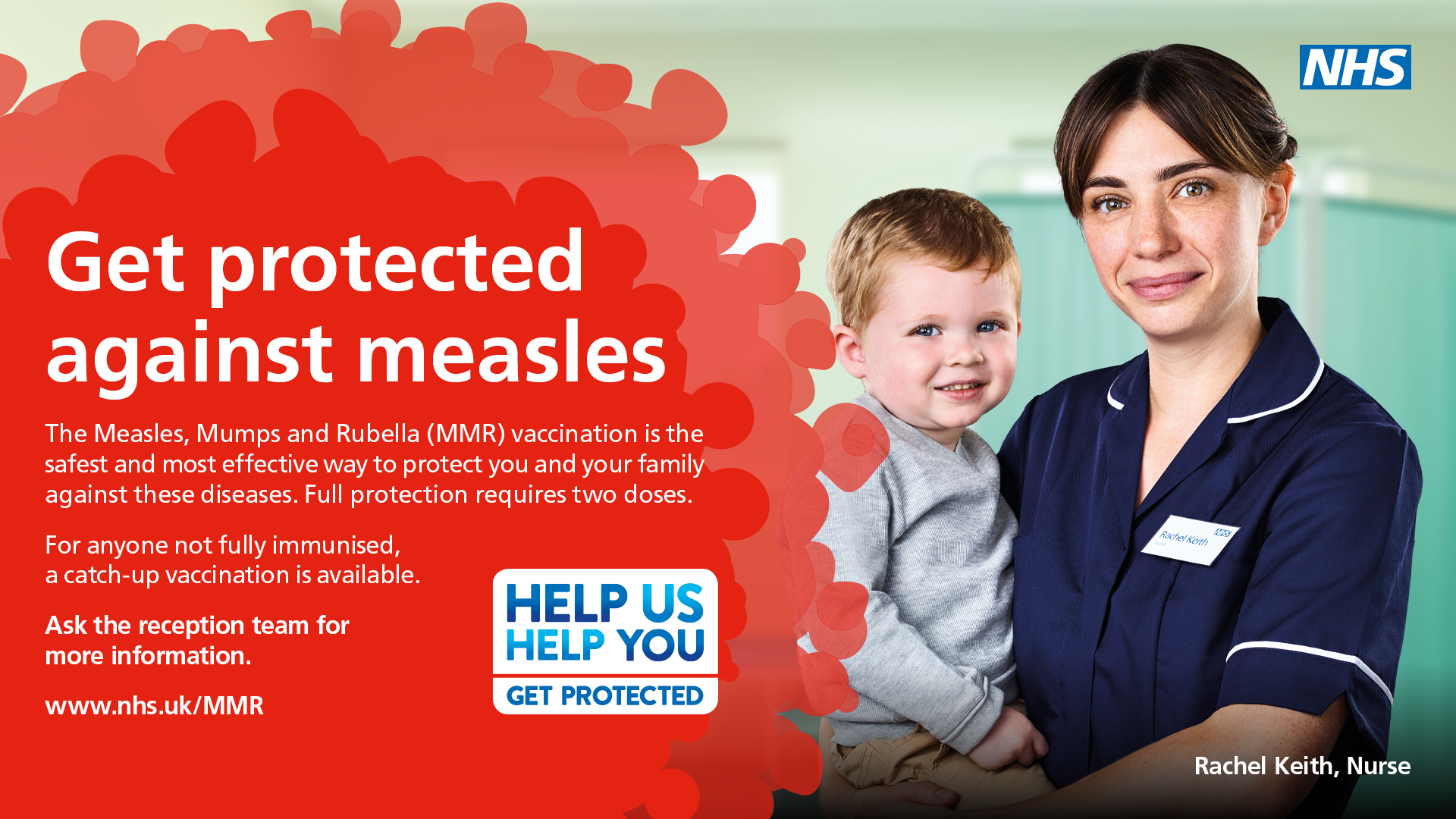 A downloadable GP practice digital display screen for practice waiting rooms. This version has an image of a Nurse with a child.